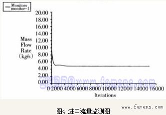 对DN40调节阀全开时进行模拟分析,迭代15000次达到收敛,模拟结果,如图3~图10所示。从残差图以及进口流量监测图,如图3、图4所示。可以看出,收敛效果很好,说明所建模型以及计算方法是合理的。