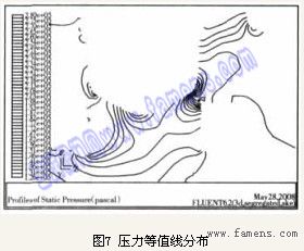 (2)从压力等值线来看,如图7所示。在阀芯附近分布较密,压力降主要集中在此。