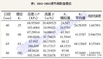 对DN40-DN80调节阀数值模拟的结果,如表1所示。由表1可知:KV值误差并不大,表明模拟结果是可靠的。